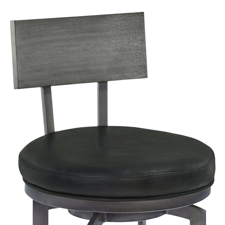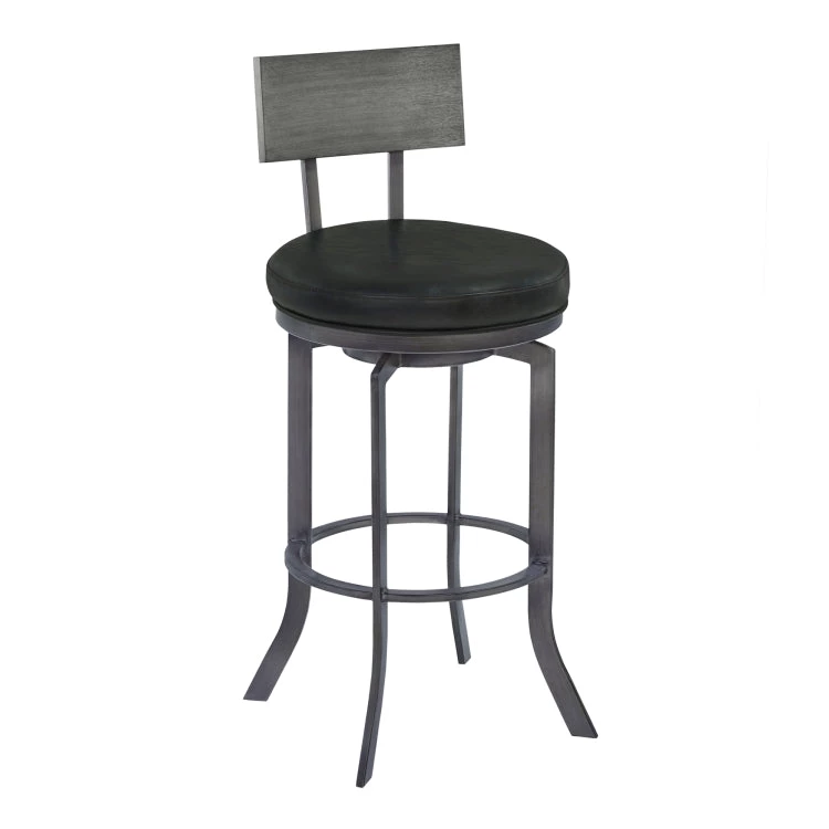 The Armen Living Ojai transitional swivel barstool is a luxurious item sure to make a statement in the modern home. The vintage black upholstered seat and rounded gray walnut wood back complement each other brilliantly, making the Ojai a standout. The frame’s mineral finish further enhances the style and sophistication of this contemporary masterpiece. The Ojai is available in 26 inch counter and 30 inch bar height.