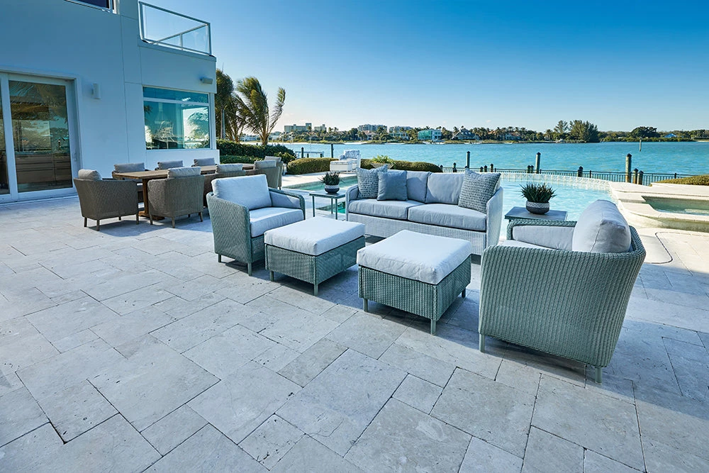 The Visions Outdoor Collection is an innovation in Lloyd Loom Wicker. Clean lines, moderate scale seating, and unique cushioned inset panels create a stunning modern silhouette.