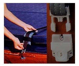 Our adjustable hold down straps are designed for added protection in windy areas. When used with our Sure-Loc Safety Fasteners, your spa cover stays in place and locked! Hold-down straps are made from 1½” nylon webbing with adjustable ½” thick foam pads. Strap length is adjustable to a maximum length of 11′ long.